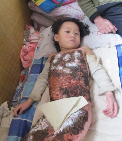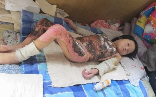 小靖琳是在两个月前被烫伤的。1月20日,小靖琳跟着妈妈去姥姥家串亲戚。中午吃饭前,活泼的小靖琳从土炕上往下跳,恰好碰到土炕边的粥锅,刚刚煮熟的一锅热粥全部倒在了小靖琳的身上。听到一声惨叫,母亲赶紧跑过来,看到孩子正满地打滚,已经昏了过去。